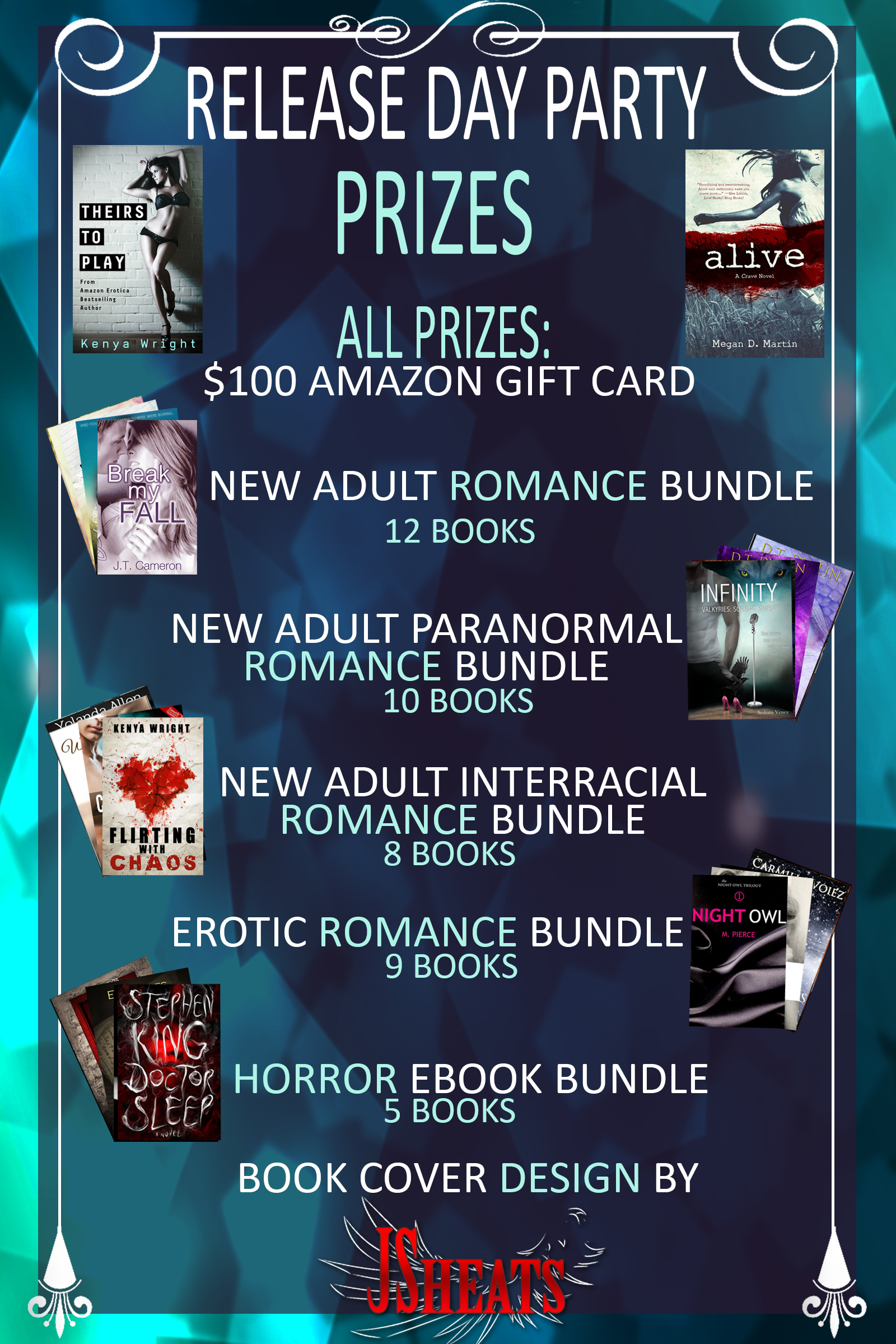 Kenya Wright & Megan D. Martin are giving away all kinds of goodies in celebration of releasing their new novels including a $100 Amazon GC, over 35 different ebooks by some awesome authors, and a free cover design by J Sheats.